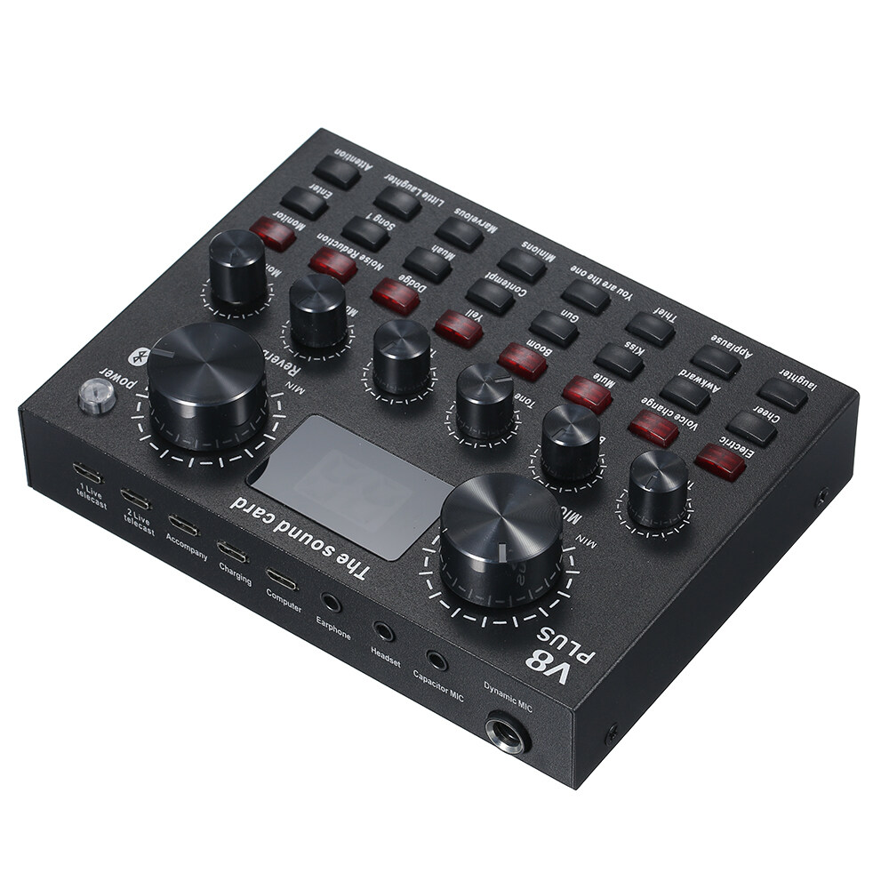 The live sound card contains 16 live effects, 12 electronic music effects, 4 sound field effects, 3 voice change. Digital display, one-key dodge, volume adjustable. It supports two phones live and one phone BT accompaniment meanwhile.