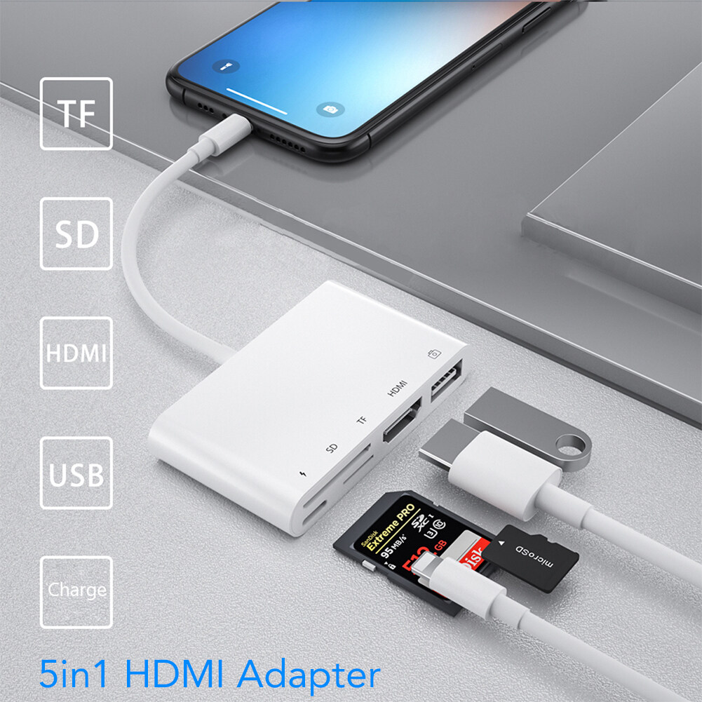 For Lightning to HDMI Adapter, 5 in 1 Plug and Play 1080P SD TF Card USB Camera Reader OTG Adapter for iPhone 12/11/iPad for apple ios 13 / 14 converter(Charging Cable is Included)