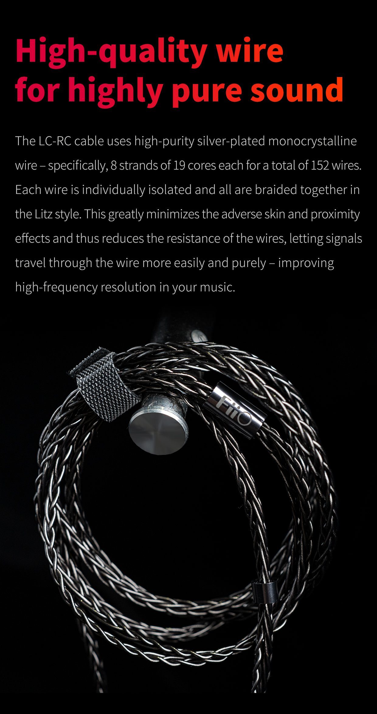 The LC-RC cable uses high-purity silver-plated monocrystalline wire – specifically, 8 strands of 19 cores each for a total of 152 wires. Each wire is individually isolated and all are braided together in the Litz style. This greatly minimizes the adverse skin and proximity effects and thus reduces the resistance of the wires, letting signals travel through the wire more easily and purely – improving high-frequency resolution in your music.