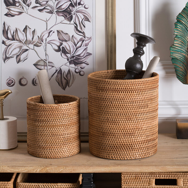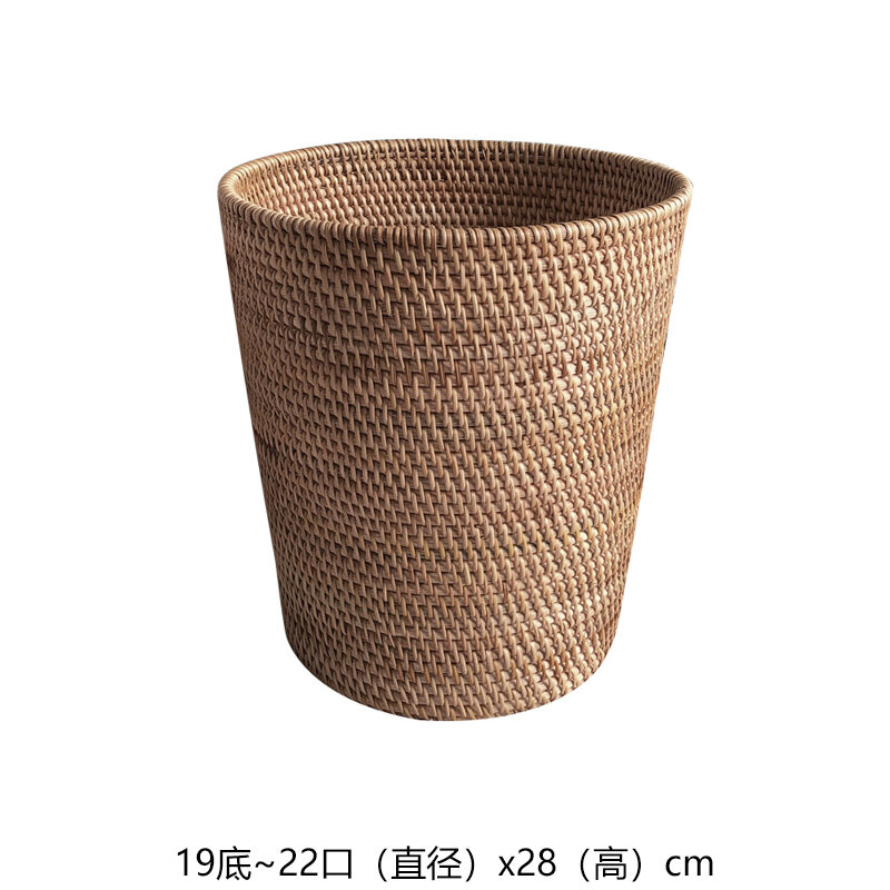 Solid Wood Rattan Household Living Room Trash Can round Bedroom Vintage Storage Bucket Handmade Personalized Study Desktop Paper Basket