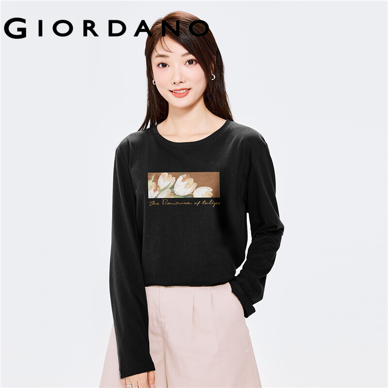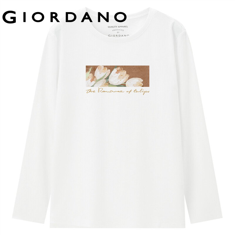 GIORDANO Women Huaxiansheng Series T-Shirts Crewneck Long Sleeve 100% Cotton Tee Simple Print Fashion Casual Tshirts 99392187