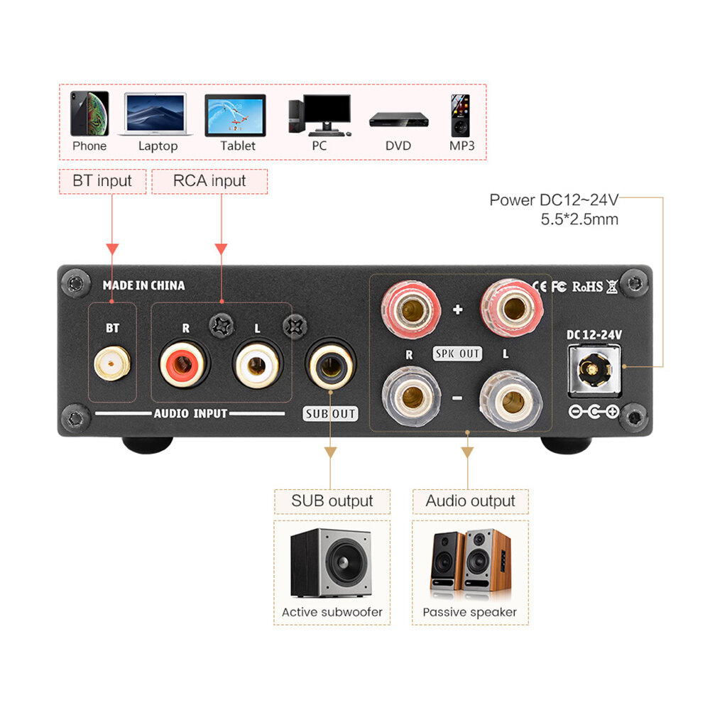 6. Input mode: analog and Bluetooth input function. When the two methods are input at the same time, the Bluetooth input is given priority. After the Bluetooth connection, The RCA input is automatically disconnected; when analog input is required, please turn off the Bluetooth function of the mobile phone to switch.